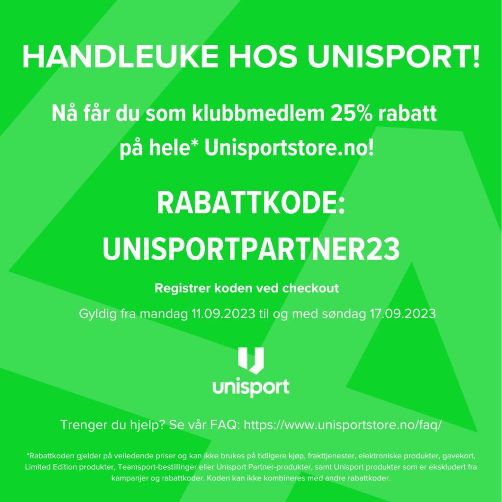 Ved å benytte rabattkoden nedenfor, vil klubbens medlemmer få 25% rabatt på Unisportstore.no*.